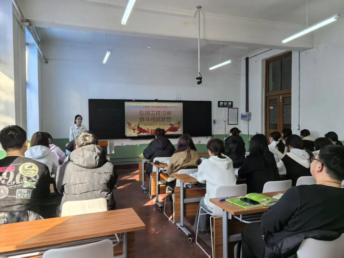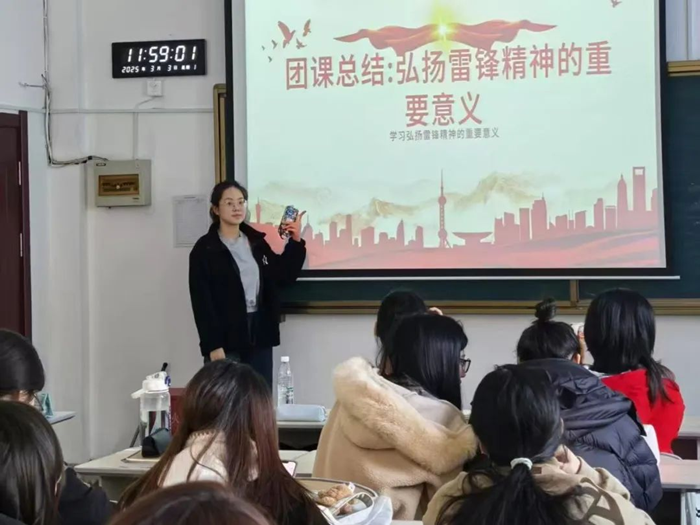 各团支部积极响应,精心构建"理论+实践"的学习矩阵。在理论学习环节,青年学子们围坐成"信仰之环",通过影像史料重温雷锋同志的动人篇章:风雨中搀扶老人的温暖臂弯,军营里为战友浆洗的质朴身影,螺丝钉般扎根岗位的坚守执着......这些跨越时空的精神印记,在春日暖阳中愈发鲜活。当主讲人讲到"把有限的生命投入到无限的为人民服务之中"时,教室里响起经久不息的掌声。