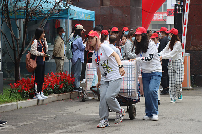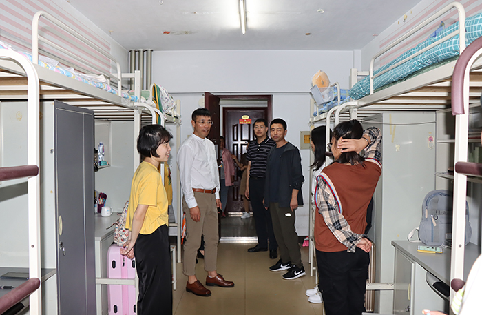 公司在火车站、汽车站设立接待点,校园内设立接待处。由于疫情原因,不允许家长进入校园,新生到校后有序排队保持距离,进行体温检测、消杀,查看行程单、一证两码后进入校园,公司部署了近300名员工干部志愿者及时地为新生提供引导服务,带新生领取生活用品,帮新生提行李,带新生入住宿舍,向新生介绍校园设施等等,让新生有了宾至如归的感觉,极大的减轻了新生的环境陌生感,让新生们更好的融入校园生活。下午三点半,公司领导班子成员深入到2020级新生宿舍走访慰问并与同学们亲切交谈。