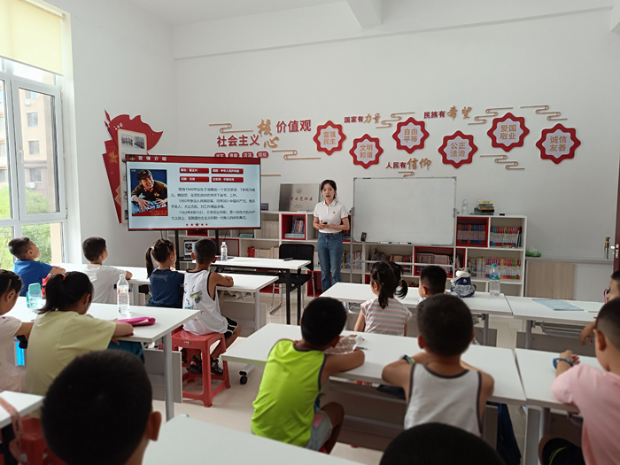 在学苑社区红领巾之家,宣讲团成员薛昊斌同学以“学习雷锋精神争做追锋少年”为题,为孩子们讲述了雷锋同志的生平简介、雷锋精神和雷锋事迹,让孩子们沉浸式地学习和感受雷锋事迹,在场的小朋友们表示:“我们要以雷锋叔叔为楷模和榜样,从力所能及的小事做起,争取做一个新时代的‘雷锋式’好少年。”
